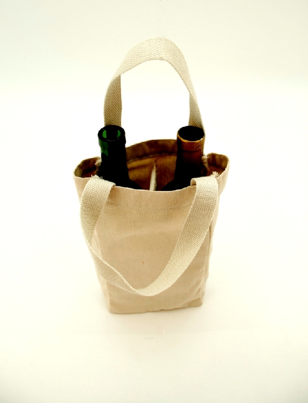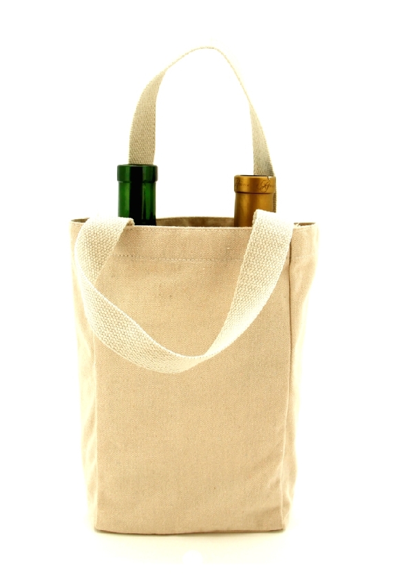 Specially designed tote bag to hold two 750ml bottles of wine or one large one. Made with durable 10 oz. cotton canvas featuring a padded center divider that folds flat and durable fabric webbed handles.