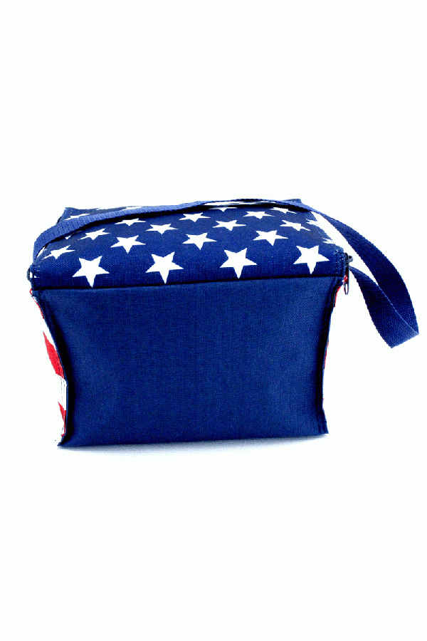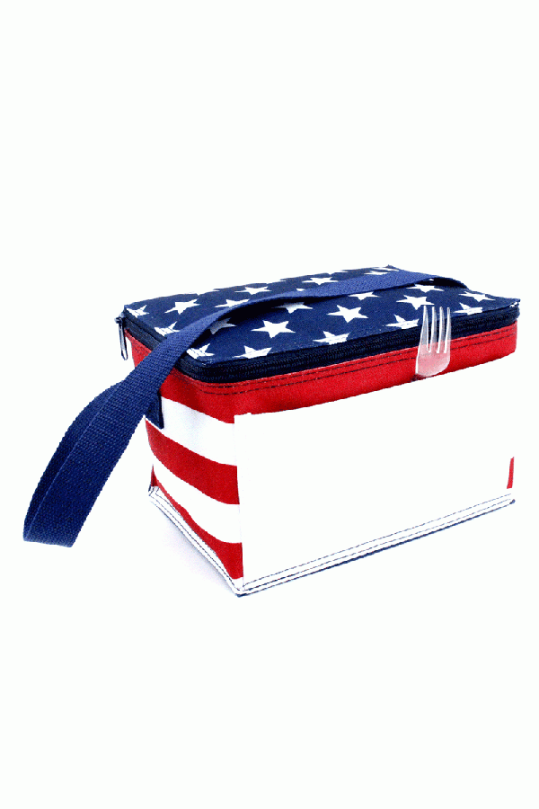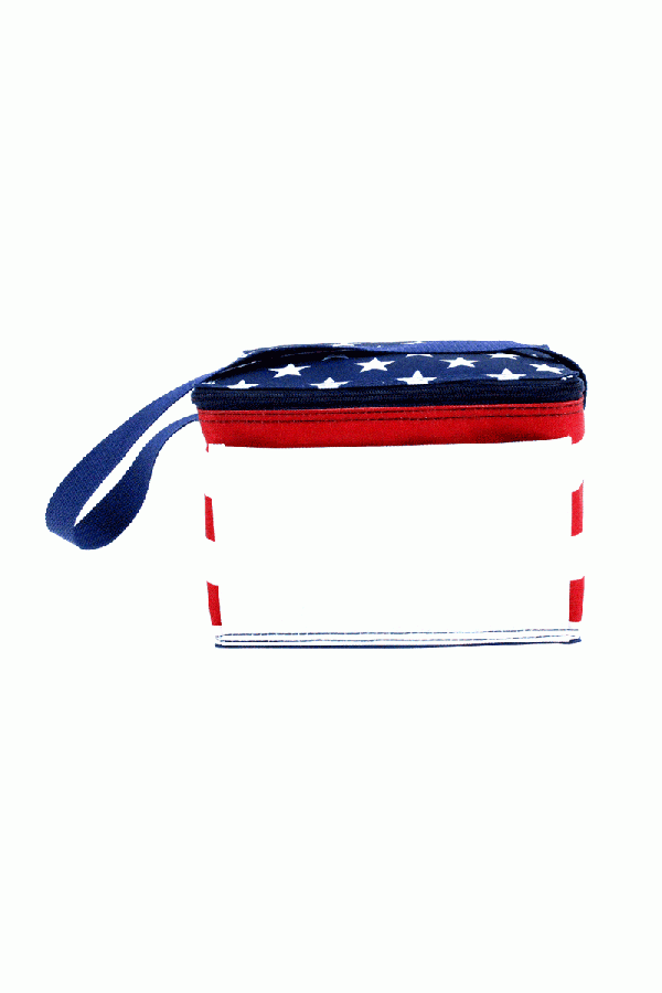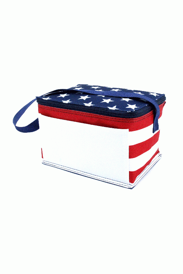 Red, White, and Blue American Flag 6 pack cooler with a top zippered closure, webbed shoulder strap, and open front pocket. Insulated with lead free PEVA lining and is heat sealed and leak proof.